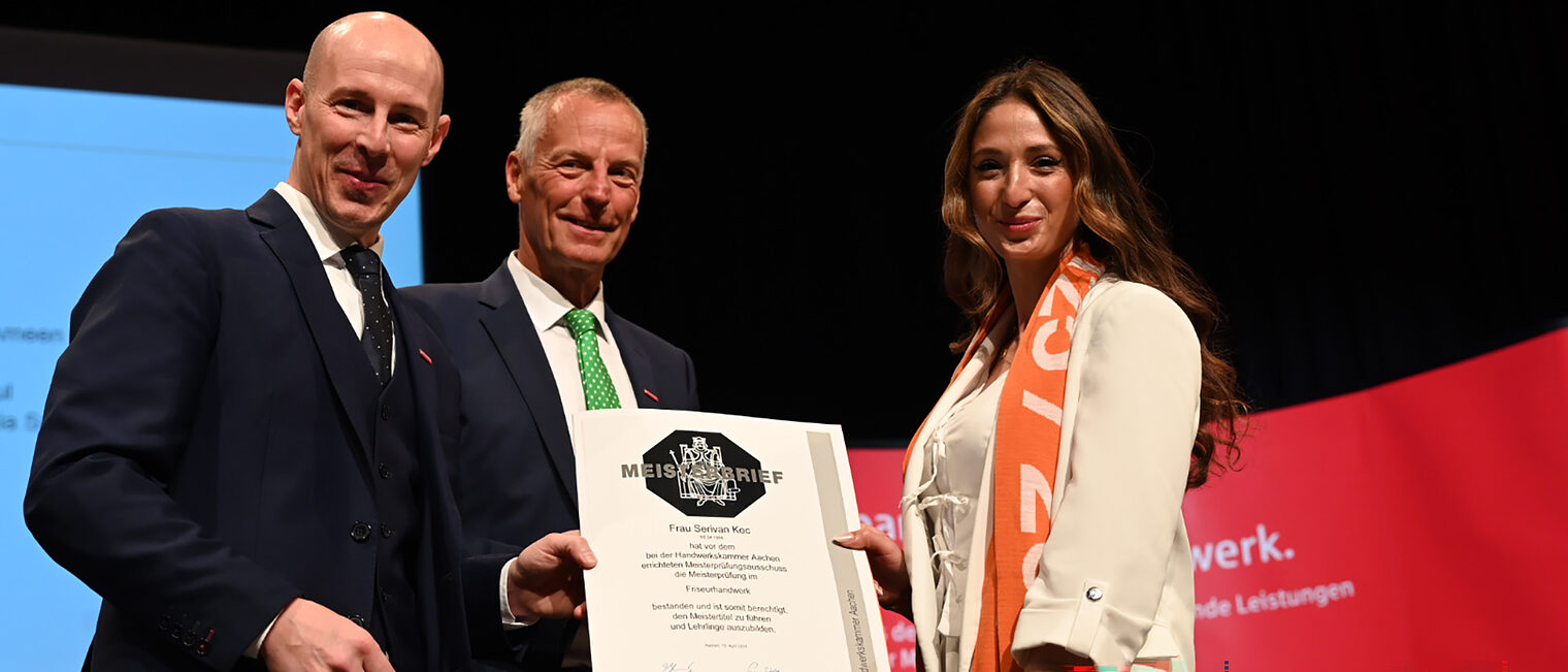 Stolz und Leidenschaft fürs Handwerk prägen die Stimmung bei der Meisterfeier: Hier präsentiert die frisch gebackene Friseurmeisterin Serivan Koc ihren Meisterbrief, HWK-Präsident Marco Herwartz (l.) und Hauptgeschäftsführer Georg Stoffels sind die ersten Gratulanten.