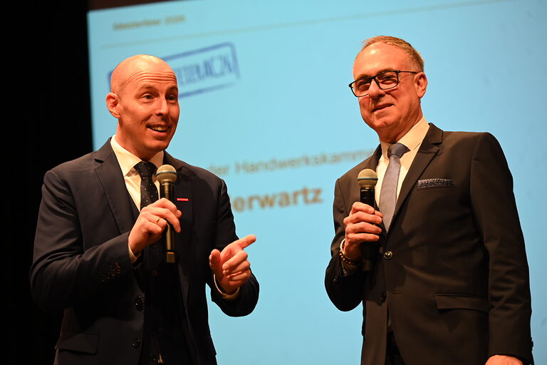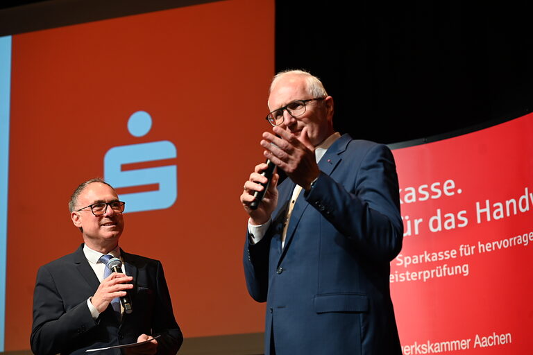 Vor rund 850 Gästen überreichten Marco Herwartz und HWK-Hauptgeschäftsführer Georg Stoffels auch an sieben Absolventinnen und Absolventen ihre Zeugnisse als Betriebswirte nach der Handwerksordnung. Diese Qualifikation ist im Deutschen Qualifikationsrahmen auf der gleichen Stufe wie ein Hochschul-Masterabschluss angesiedelt. „Noch immer ist vielen nicht bekannt, dass man mit einem Hauptschulabschluss, einer anschließenden Ausbildung, der Meisterschule und dem Betriebswirt die höchste Qualifikationsstufe in unserer Bildungsnation erreichen kann“, erläuterte Herwartz.